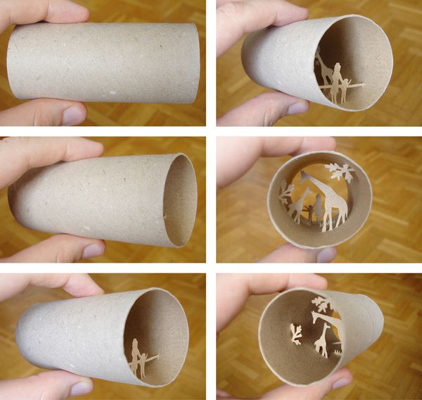 Anastassia Elias, primarily a painter and illustrator, carves tiny scenes out of the inside of each brown paper roll, leaving the outside intact. The subjects are engaged in everyday activities like relaxing at home, listening to a lecture or passing through a street market